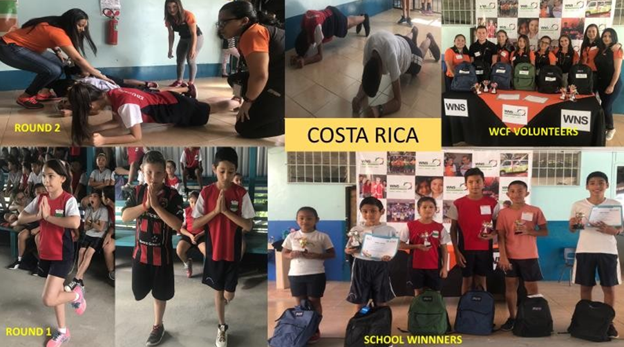 Children in Costa Rica doing various exercise, and the winners of LEAP competition presented with certificates and trophies